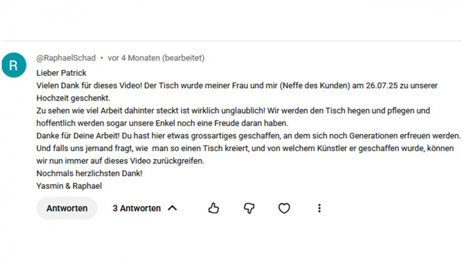 Praxis Beispiel: ein sehr sympatisches Juristen Ehepaar hat einen großen abgestorbenen Nussbaum im Garten. Der Großvater hatte ihn gepflanzt, viele schöne Kindheitserinnerungen sind mit ihm verbunden und er soll "erhalten" bleiben. Wir haben diesen Baum in Klettertechnik gefällt, vor Ort in Tisch Rohlinge aufgesägt und an der Hausrückseite sauber aufgestapelt. Letztendlich kann ich auch noch nach der Trocknung (ca.2-3 J) Ihren Wunschtisch daraus bauen. Dazu holen wir die Stücke ab, trocknen sie final in einer Trockenkammer und daraus entsteht dann in reiner Handarbeit in meiner Stuttgarter Tischmanufaktur ein absolut einmaliger Esstisch für dieses Ehepaar. So etwas kann man für kein Geld der Welt nirgends kaufen.
