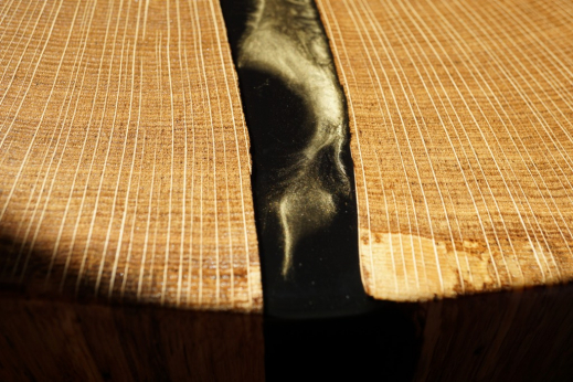 Info: Oak slice with spectacular epoxy filling in black/gold. The tree was too close to a garage and had to be cut down (although it had been there first). Fortunately, since I knew the owner and was able to trade with him, I was able to saw up this large old oak on site and put it in storage. This slice comes from the oak and has now "advanced" to a real eye-catcher. Until the piece has then become so has cost many hours of work...