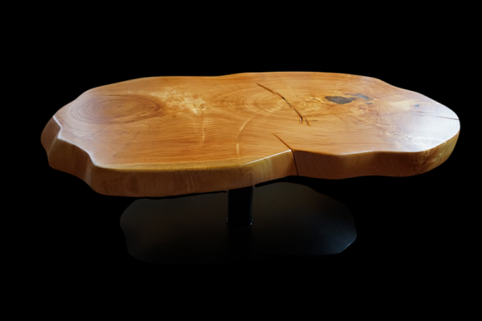 Mein Modell 3 ist eine individuelle Sonderanfertigung/ein Einzelstück für einen Couchtisch. Es ist aus dem vollen Stahlblech lasergeschnitten und schwarz pulverlackbeschichtet. Die Basis wurde passend zu der Tischplattenform der Weidenholzscheibe angefertigt. Der Couchtisch selbst ist etwa 120 x 60 cm groß.