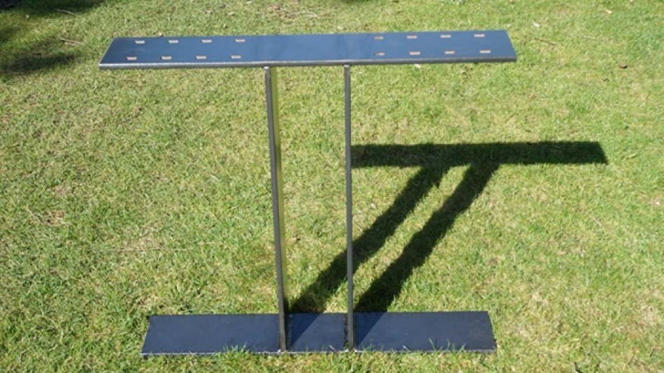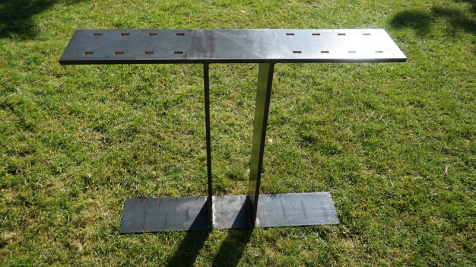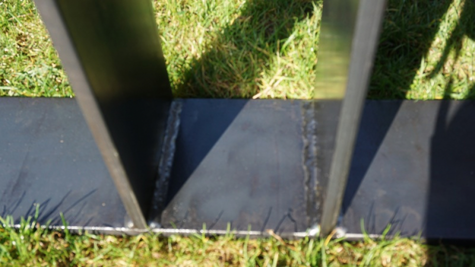 Mein Modell No.3, ein Esstisch Untergestell aus lasergeschnittenem massiven Stahlblech, sogenannten Breitflachstahl in extra starken 12 mm Dicke. Die Oberfläche ist original Schwarzstahl roh und wurde - da der Kunde einen "industrial look" haben wollte - in transparentem Lack pulverbeschichtet.