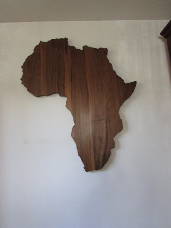 Diese maßstabsgetreue Afrika Wandbild Einzelanfertigung für einen amerikanischen Kunden ist etwa 150 cm hoch und maximal 130 cm breit und etwa 18 mm stark. Es wurde aus ca.20 cm breiten Lamellen aus augesuchtem tiefdunklem amerikanischen Nussbaum verleimt und in reiner Handfertigung ausgearbeitet. Die Befestigung an der Wand wurde mit Dübeln und Haken ausgeführt, wozu auf der Rückseite Gewindemuffen in das massive Nussbaumholz eingebracht wurden, was eine extrem starke und dauerhafte Verbindung garantiert. Die Oberfläche ist mit biologischem Hartöl mehrmals behandelt, sowohl auf der Rück- wie auf der Vorderseite, d.h. ein Pflegeaufwand - falls überhaupt - wird erst nach einigen Jahren nötig sein und ist sehr einfach und schnell durchführbar.
