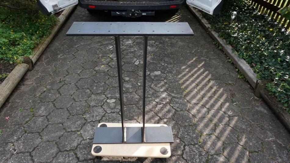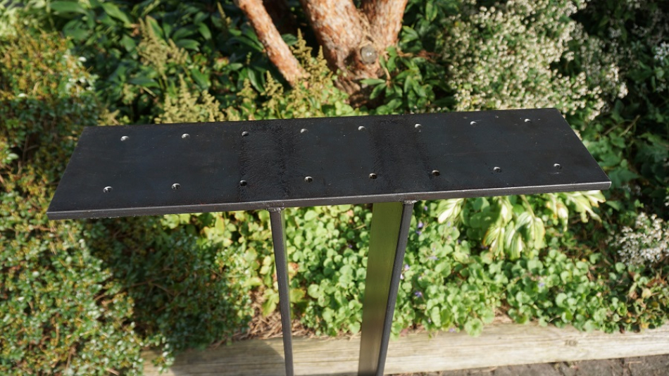 Details: Schwarzstahl roh lackiert/industrial lool inkl. Klarlack; Montagelöcher 2 Reihen a 7-8 Bohrungen gesenkt; Unterseits je Fuß 4 Montagelöcher (nicht durchgehend) mit Innengewinde für Stellfüße