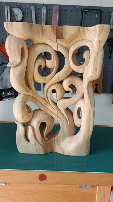 Ein handgeschnitztes Tischuntergestell aus massivem Weidenholz. Für die Befestigung mit der zukünftigen Tischplatte wird oberseits noch eine gelaserte schwarz pulverlackbeschichtete rechtwinklige oder ovale Stahlplatte angebracht werden und ebenso am Boden um die Standfestigkeit zu erhöhen. Hierdurch wird das Untergestell nochmals zusätzlich aufgewertet.