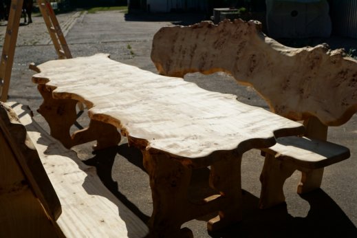Info: Diese Garnitur ist eine Ausnahme bei uns und wird es so nie wieder geben. Es ist ein Unikat aus einer spektakulären Maserpappel am Stück, d.h. keinerlei Verleimungen. Mittlerweile sind die Verbindungsteile aus schwarz pulverlack beschichtetem Stahl. Diese Garnitur stammt aus Ungarn und kam zufällig in meine Hände. Wie ich sie das erste mal sah war ich fasziniert von der Schönheit und Extravaganz dieser Garnitur. Die Maserung dieser Pappel ist besonders stark ausgeprägt und die Garnitur ist richtig groß. Für den Außenbereich geht sie zwar (Regenschutz ist jedoch zwingend nötig) wäre mir persönlich jedoch viel zu schade dafür. Für ein geselliges Zusammensitzen mit Freunden kann ich mir nichts Geeigneteres vorstellen. Die fröhliche und spielerische Ausstrahlung wird sich mit Sicherheit auf die Gäste übertragen.